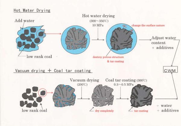 An upgrading process for low rank coals was developed to produce a highly loaded coal water mixture (CWM). The upgrading process was consisted of a combination of vacuum drying and tar coating processes. The maximum temperature and pressure were 300℃ and 0.5 MPa, respectively. This treatment has enabled us to prepare a CWM with substantially high solid content with reduced viscosity.