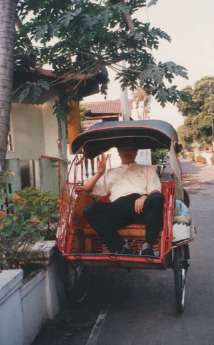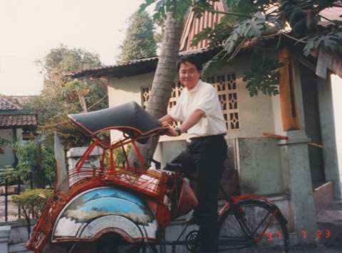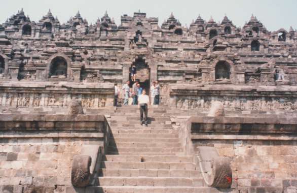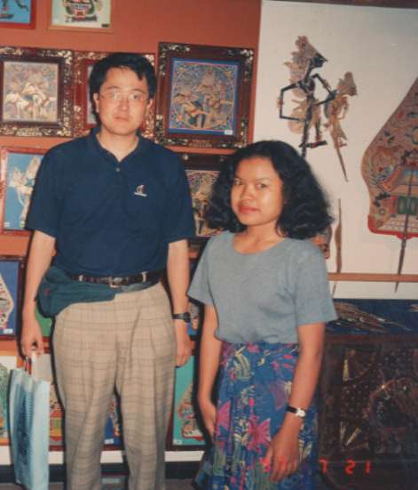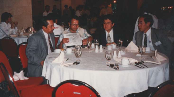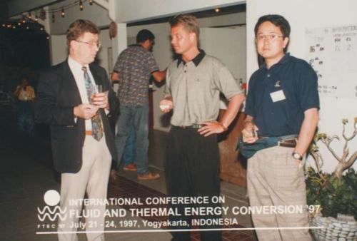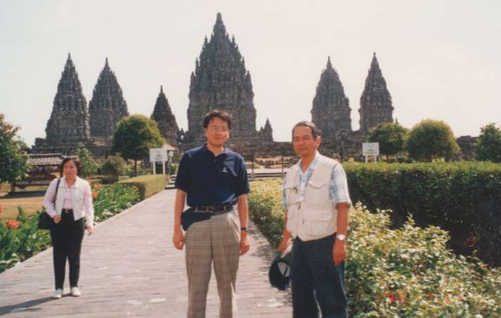 <私の発表タイトルと概要> Ship Transportation of Coal Water Mixtures Hiromoto Usui, ○Takashi Saeki, and Tsuyoshi Chuman (山口大学) Department of Chemical Science and Engineering, Kobe University, 1-1 Rokkodai, Nada, Kobe, 657, JAPAN Harumitsu Yanagimachi (日揮株式会社) No.2 Project Div., JGC Corporation, 1-chome Bessho, Minami-ku, Yokohama, JAPAN ABSTRACT The sedimentation of coal particles occurred during the ship transportation is most severe problem in the CWM transportation processes. Possible mechanism of particle sedimentation under shear is discussed in this study and some modification of tank shape in a CWM tanker to improve the sedimentation stability is proposed. <私の発表に対する質問> 鹿児島大学の先生から、CWMの調製方法に関する質問が1件。pH調整の有無について。pH調整は粒子分散系の凝集分散特性に与える影響が大きく、これにより多糖類による添加剤の効果に違いが起こるのではないかというあたりの質問であった。 <国際会議での一コマ> ●参加者 インドネシアで行われたインドネシア主催の国際会議で、インドネシアの研究者の発表も多くプログラムに載せられていたが、当日キャンセルの発表(時間になっても発表者が現れない)が多かった。参加者はやはりインドネシア人が多かったが、日本人も全体の3割くらいいたのではないかと思う。私が別のセッションの会場に聴講に行ったとき、発表開始5分前で、会場には10数人の聴講者とスタンバイ完了の発表者がいたが、全員日本人で、「日本語でしようか?」と冗談を言って日本語であれこれ雑談をしていた。するとインドネシアの大学の先生が座長として入室され、「それではみんな英語で話そう」という感じであった。私が発表したときは結構バラエティーに富んだ国籍の聴講者がおられたが、質問者は前述の鹿児島大学の前田教授だった。実は前田先生にインドネシア内をあちこちご同行させていただいていて、発表時には英語で話し、なんとも...という状況であった。 ↑ プランバナン寺院遺跡群(ヒンドゥー教寺院) ●国際共同研究の打ち合わせ 国際会議の途中、インドネシアのバンドン工科大学のSuwno教授と研究室の大学院生、および鹿児島大学、山口大学でインドネシア炭のスラリー化技術についての国際共同研究の打ち合わせを行った。↓ <インドネシア ヨグジャカルタとは。行って感じたこと、あったことなど> 広島空港からシンガポールエアラインでジャカルタまで飛び、そこから国内線(ガルーダ)に乗り換えた。ジャカルタでとりあえず現金7000円を両替。なんと13万6500ルピアという高額に代わり、なんだかお金持ちになったような気が、といっても7000円ですが。暑いのでアイスクリームでも買おう、と思い、いくらか聞くと1600ルピア、「えー、1600円もするの。いや1600ルピアか」、計算すると80円。その後、少し怖かった国内線でヨグジャカルタ空港に到着。空港からホテルまではタクシーで。タクシーにはメータがなく、乗車時に行き先を告げて先払いする。タクシー代は7000ルピア。「えー、7000円もするのか。いや7000ルピアか」13万6500の内の7000というのは大きいのかどうなのか、タクシーに乗って計算すると350円だから安いんだな、と安心する。夕食に1万5900ルピアの焼き飯を食べ、1000ルピアのチップをホテルのボーイにわたした。それぞれ795円、50円。とにかく扱うお金の桁が大きいので、近くのデパートでノートを買って、家計簿を付けることにした。買ったのは『サンリオのケロケロケロッピー』のノート。インドネシアで作っているんだ。町で話されている言葉はインドネシア語であったが、英語で話しかければほとんど問題なく、通りかかりの人が英語で通訳してくれることもあった。 学会にもツアーが組み込まれており、おみやげ売り場などにも結構行って、あれこれ買い物をした。銀製品が産物のようで、店員が「美智子様のブローチ」と盛んに宣伝していた。おそらく皇后陛下が立ち寄られたのであろう。ご一緒した機械工学科の先生はブローチの値切りにかなりのパワーを使い、「やった○○ルピア負けさせた」と言っておられたが、日本円にすると20円くらいだった。数百円のブローチを買うのに数十円負けさせていたことになる。数十円でも店員にとっては大変なことだったみたいである。 日本刀とは似ても似つかない日本刀を路地で売っている若者がいて、「私は日本人だが、この刀は日本刀とはだいぶ違う」と教えてやると、突然日本刀を抜いて「腹きり、腹きり」といって切腹のまねをしてみせてくれた。それはそれで面白かった。1年ばかりやっていた居合(いあい)の型を見せてやった。 かばん屋で旅行かばんをなんとなく見ていると「いま展示会(Exibition)をしている、是非行ってみてくれ」と長身の男性に誘われ、「ついて来い、さあ」というので、「まあ展示会なら」と思って後ろを歩いた。するとだんだん小さな路地になり、何度もその路地を曲がり、それでもまだどんどん歩いていった。「おいおい」と少し抵抗したが、「もう少しだから」みたいな感じで